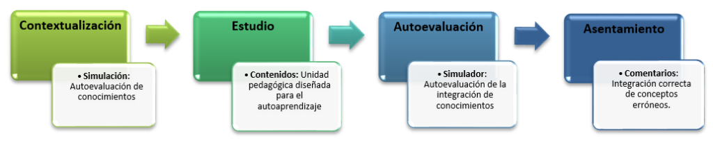 - Asentamiento: La realización y revisión reiterada de los test de simulación de unidad permiten que el alumno compruebe y retenga los conocimientos adquiridos. La simple constatación de los errores cometidos y la lectura de los comentarios del profesor centran el foco en aquellos conceptos que no han sido retenidos adecuadamente permitiendo que el alumno revise nuevamente aquellas cuestiones que no le han quedado claras. El simulador agregado permite al alumno ir construyendo conocimiento a partir de la agregación de preguntas de todas las unidades pedagógicas que acumula.